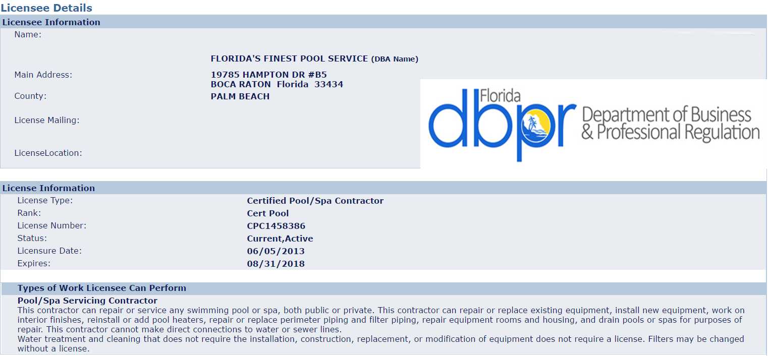 Florida's Finest Pool Service is state certified which allows us to legally repair pool equipment. In addition, our repair technicians regularly take continuing education courses to remain current and ensure the highest quality of repair work. Our repair scope also includes heaters, as we are LP 0408 licensed to repair and replace them. Most pool companies are not; having non-licensed personnel work on your heater can void your warranty.